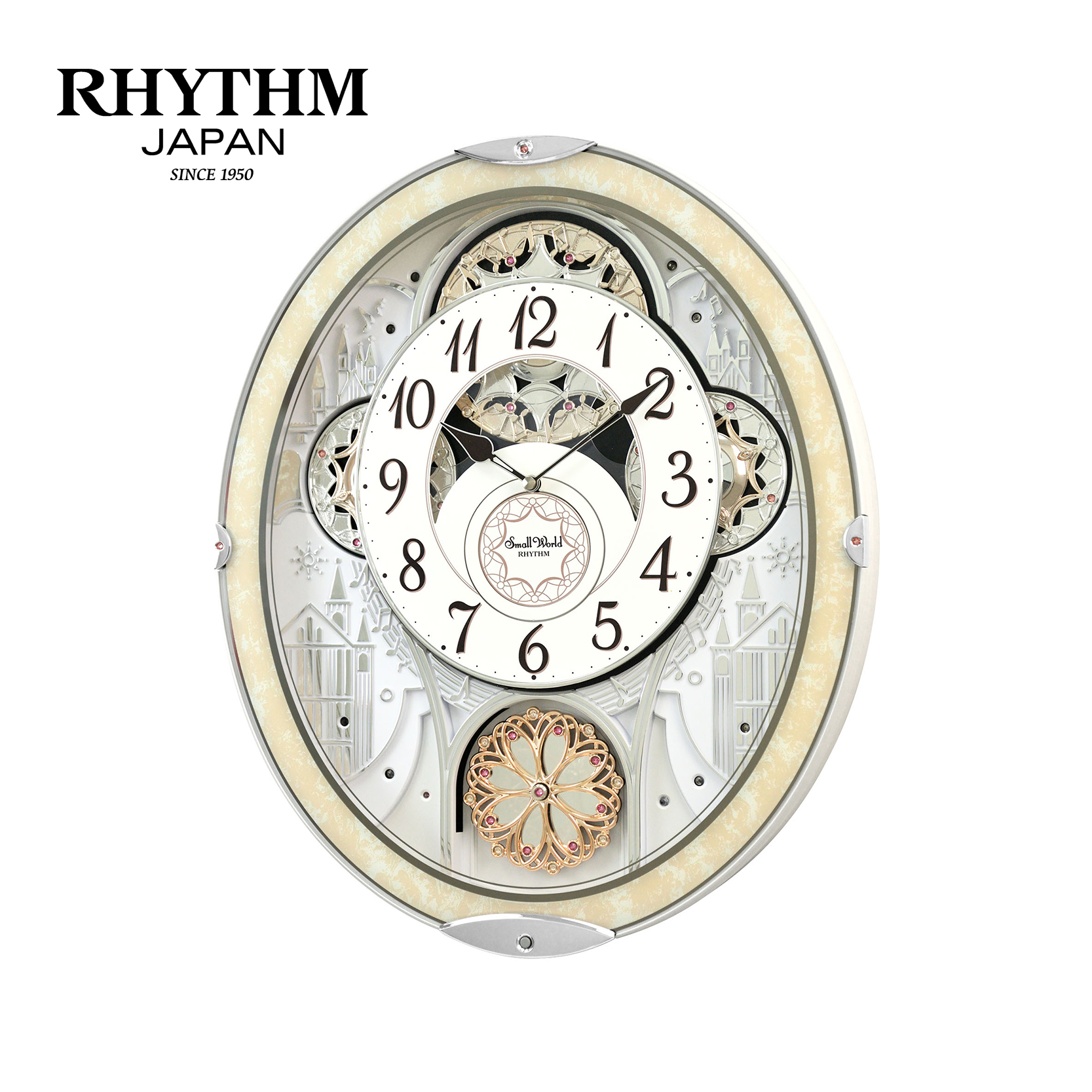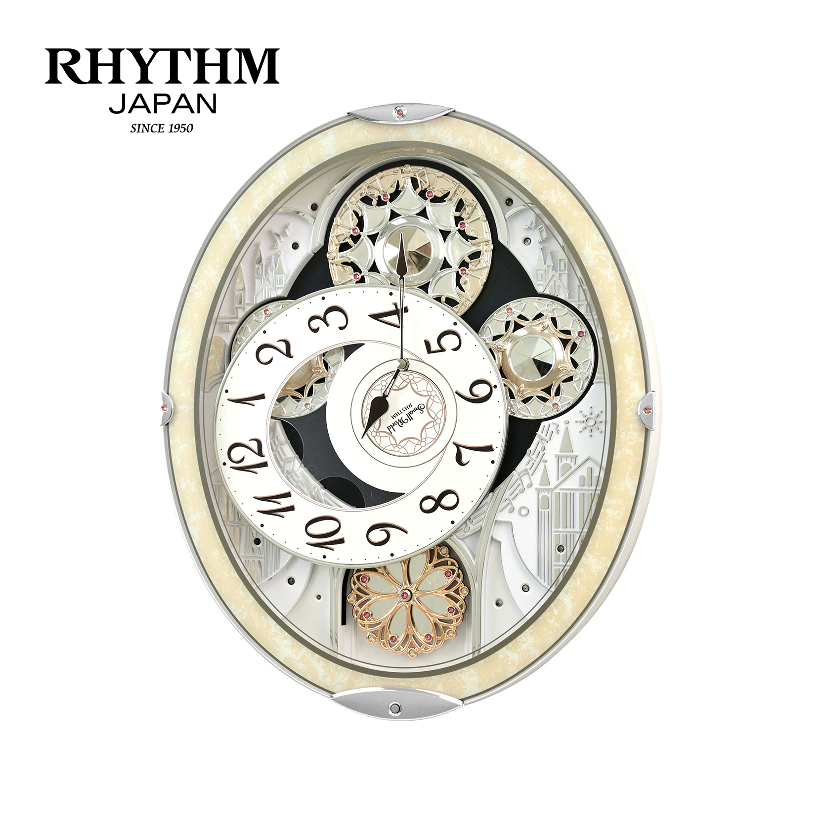 Mỗi đầu giờ nhạc trỗi lên, mặt số xoay ngược xuống để lộ các bánh răng xoay uyển chuyển nhịp nhàng kết hợp với quả lắc cẩn đá pha lê xoay tròn tạo nên chuyển động vui tươi, phá tan tỉnh lặng, đem lại vượng khí cho không gian gia chủ. Có núm chỉnh âm lượng tiện lợi.